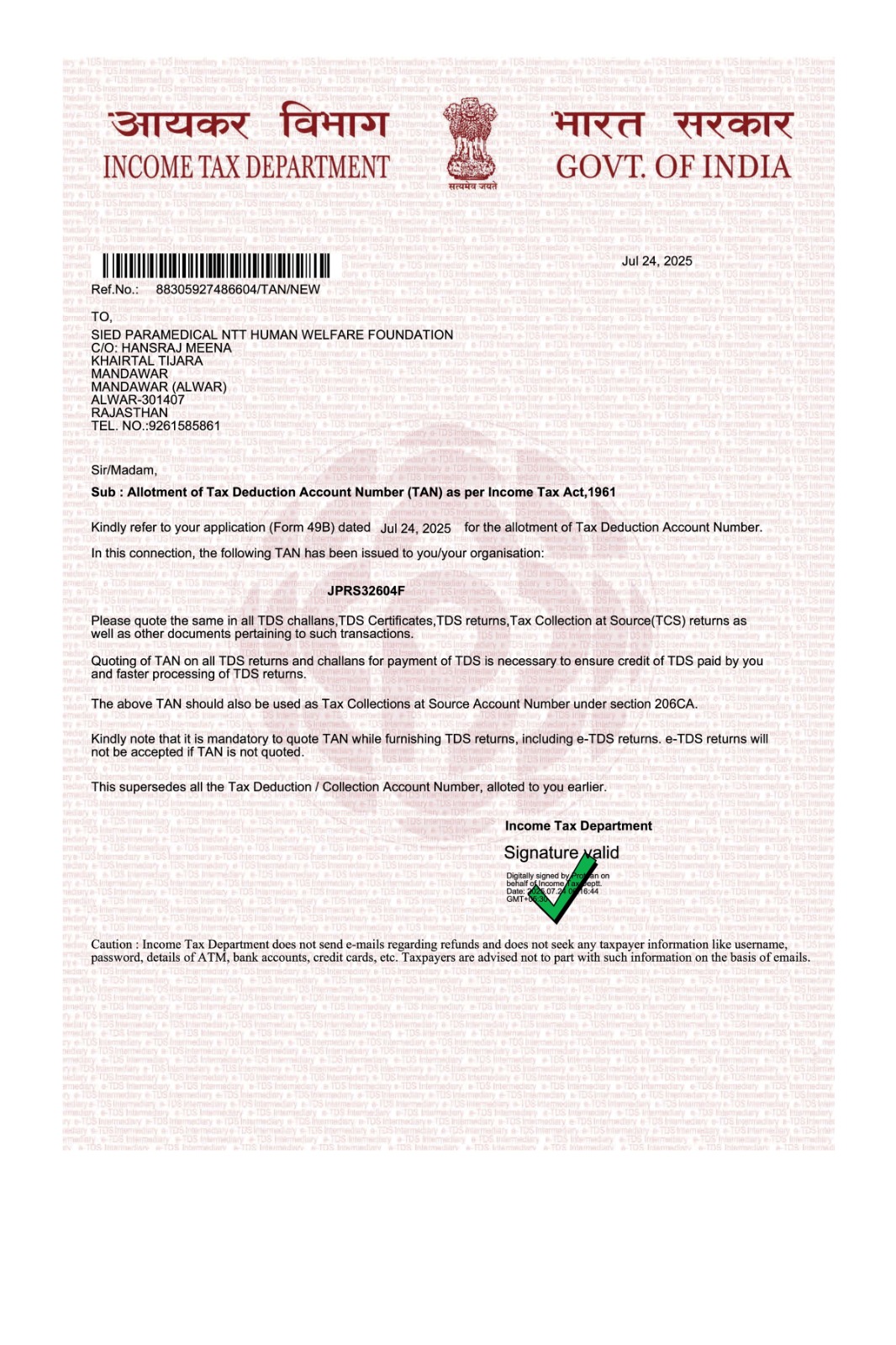 TAN Certificate